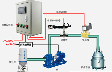 一般的定量控制系统是由流量计、流量积算仪、电磁阀和定量控制箱等装置组成,可实现对流体的定量计量、定量灌装、定量配料等过程的控制。结构如图所示: