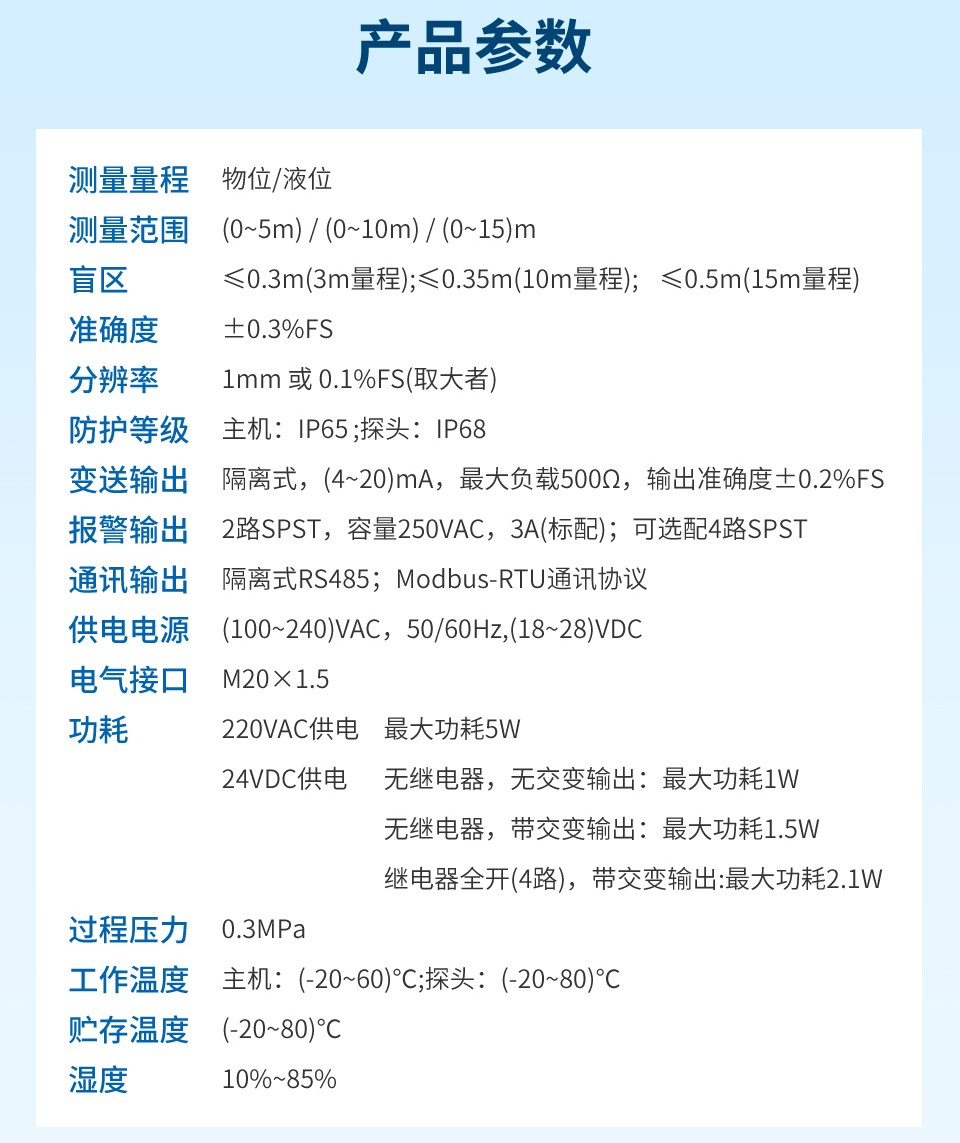 准确度: ±0.3%FS测量范围: (0~5)m、(0~10)m 、(0~15)m(可选)盲区 :分体式≤0.3m(5m)、 ≤0.35m(10m)、 ≤0.5m(15m)