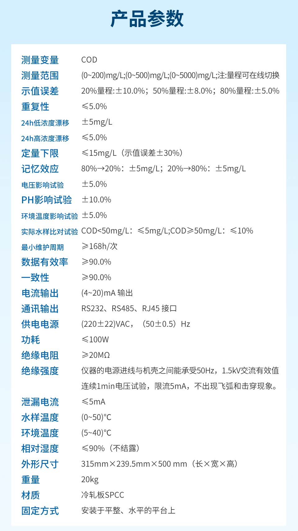测量范围:(0~2000) mg/L;可根据客户需求定制示值误差:20%量程:±8%;50%量程:±5%;80%量程:±3%重 复 性:≤3%