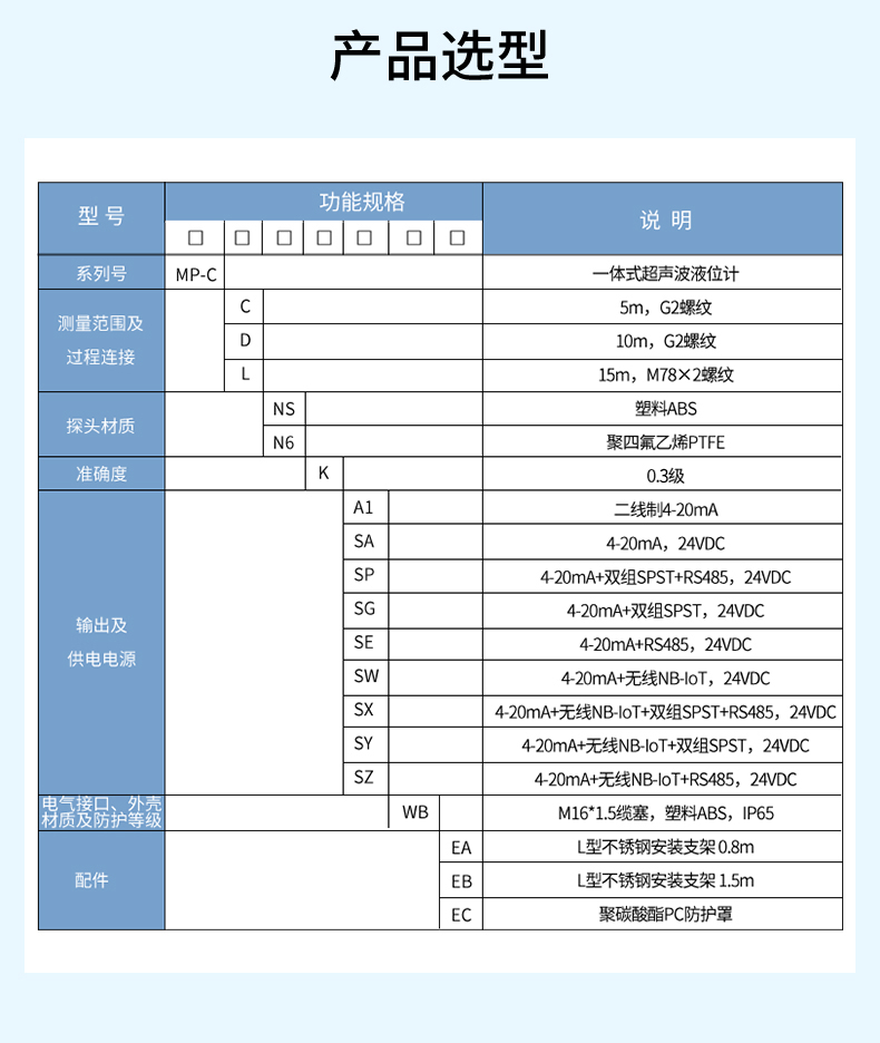 准确度:0.3%FS盲区: ≤0.4m(5m、10m) ;≤0.6m(15m)防护等级:仪表(IP65) 探头(IP68)