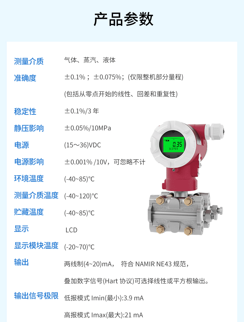 准确度:±0.1% ; ±0.075%;(仅限整机部分量程)环境温度:(-40~85)℃测量介质温度:(-40~120)℃