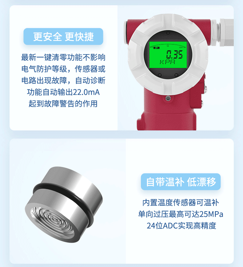 本款单晶硅差压变送器在电路设计上采用以微处理器为核心并辅助以先进的数字隔离技术的模块化设计,使仪表具有极高的抗干扰性及稳定性,同时通过内置温度传感器对变送器进行补偿,提高了测量精度,降低了温度漂移,具有长期稳定性好,可靠性高,自诊断能力强等特点。在结构上,用户很方便的通过 HART 通讯手操器对变送器进行标定、设置和组态