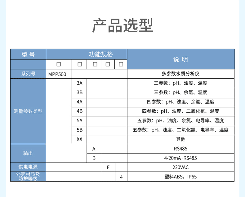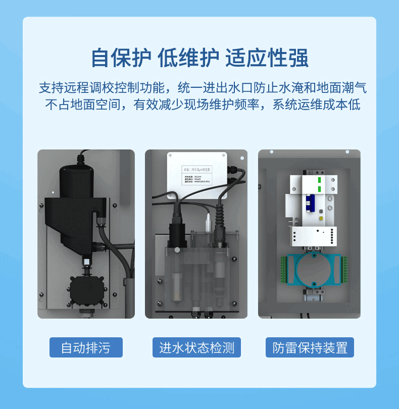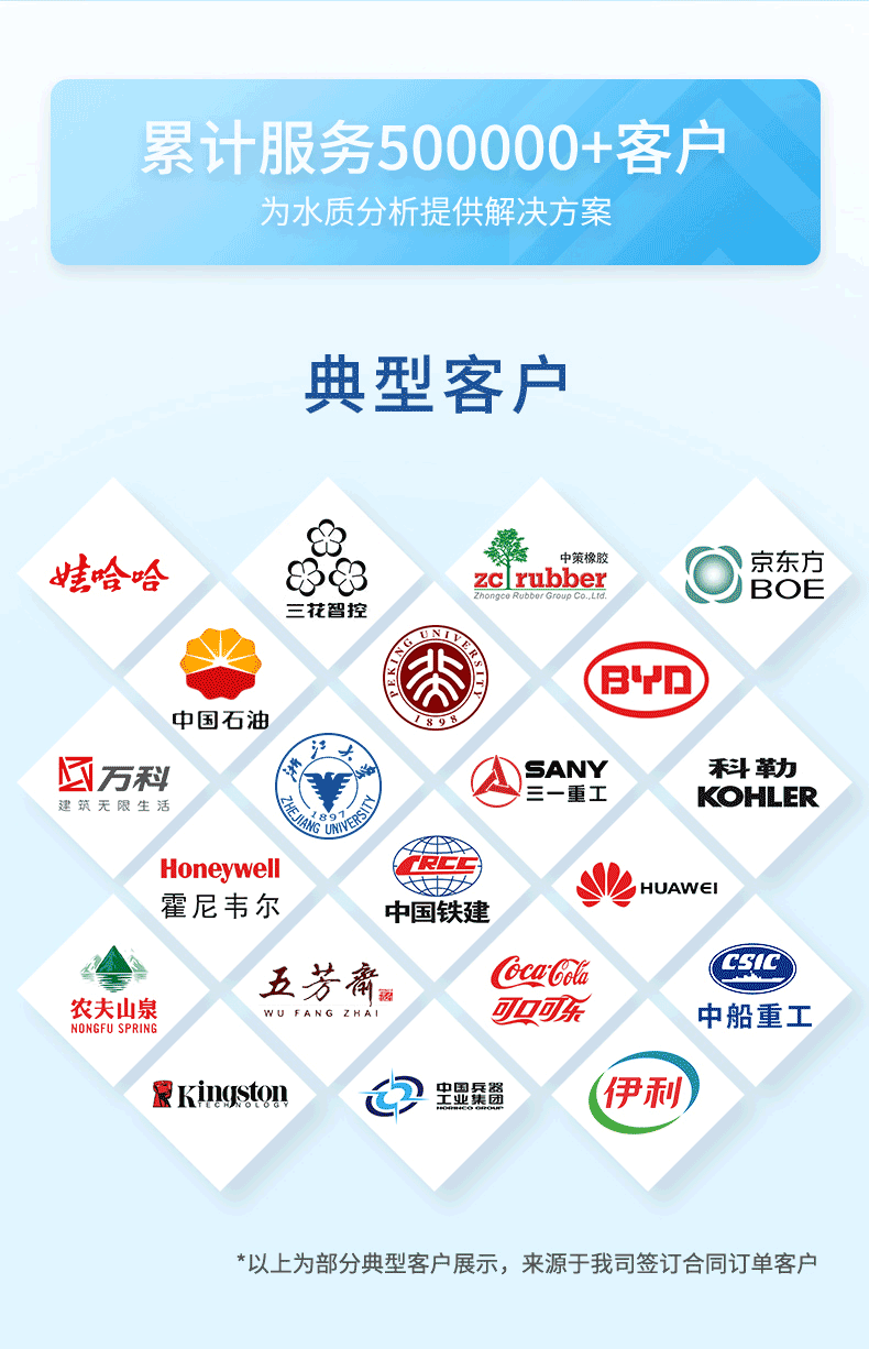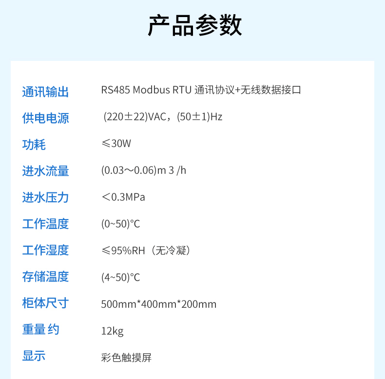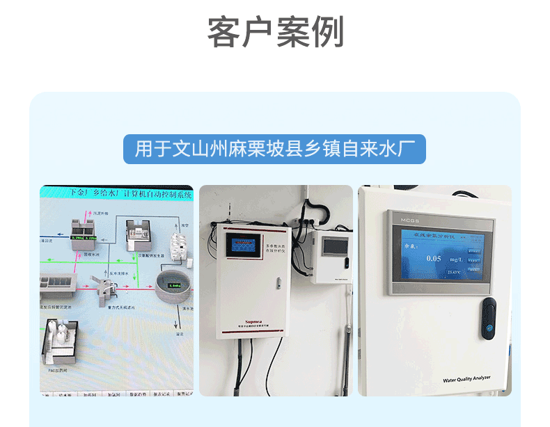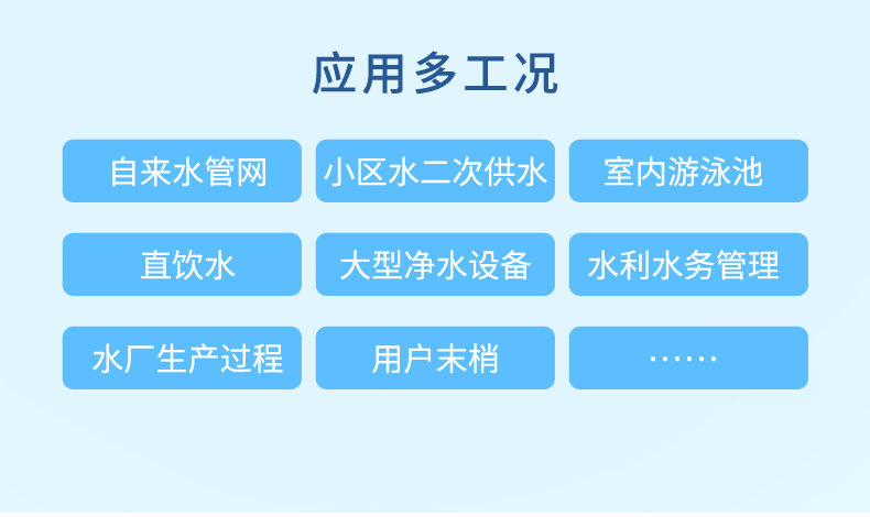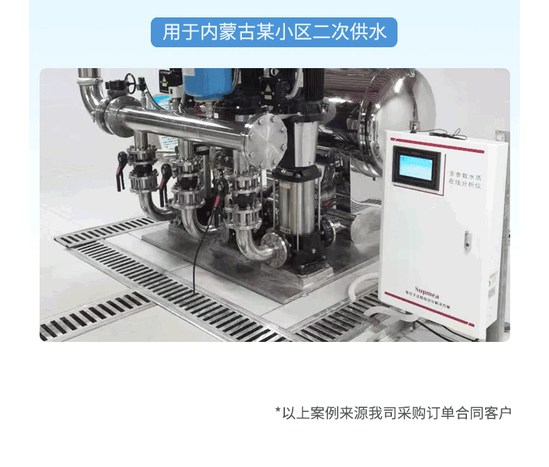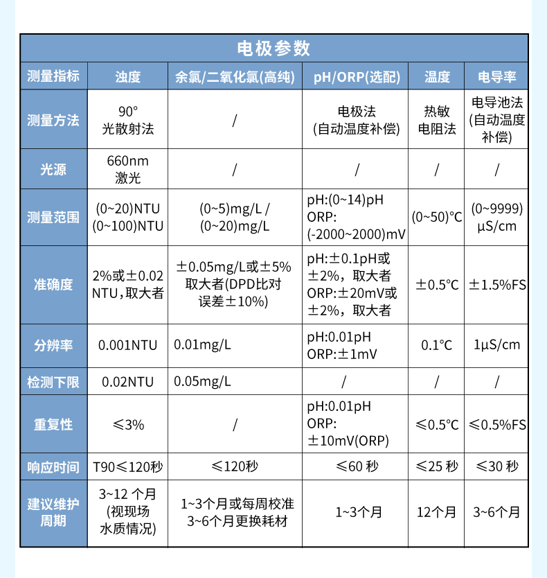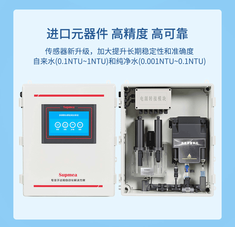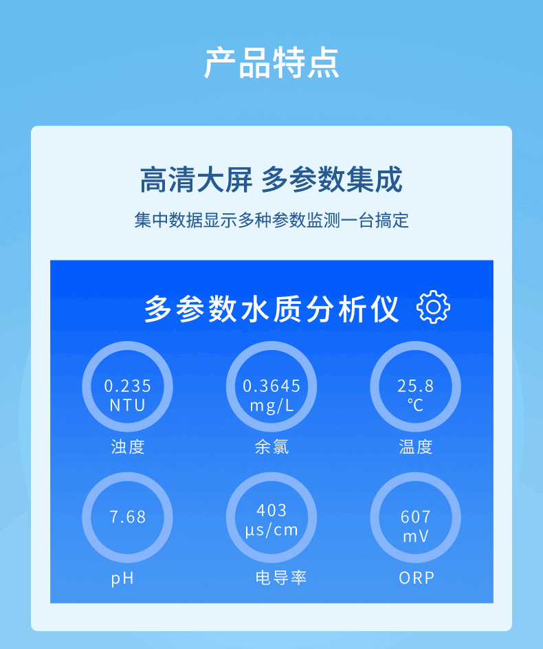 标准版监测参数包括浊度、余氯/二氧化氯、pH、温度。定制版增加参数包括电导率/TDS、溶解氧、ORP等