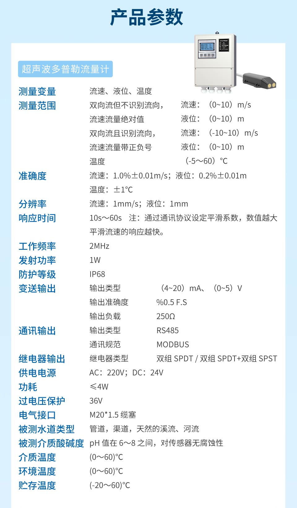 测量范围 流速:(0.1~2)m/s 液位:(0~20)m /(0~30)m精确度 流速:3%±0.01m/s 液位:0.2%±0.01m