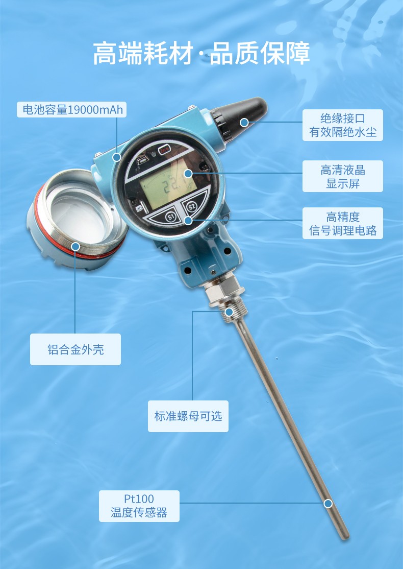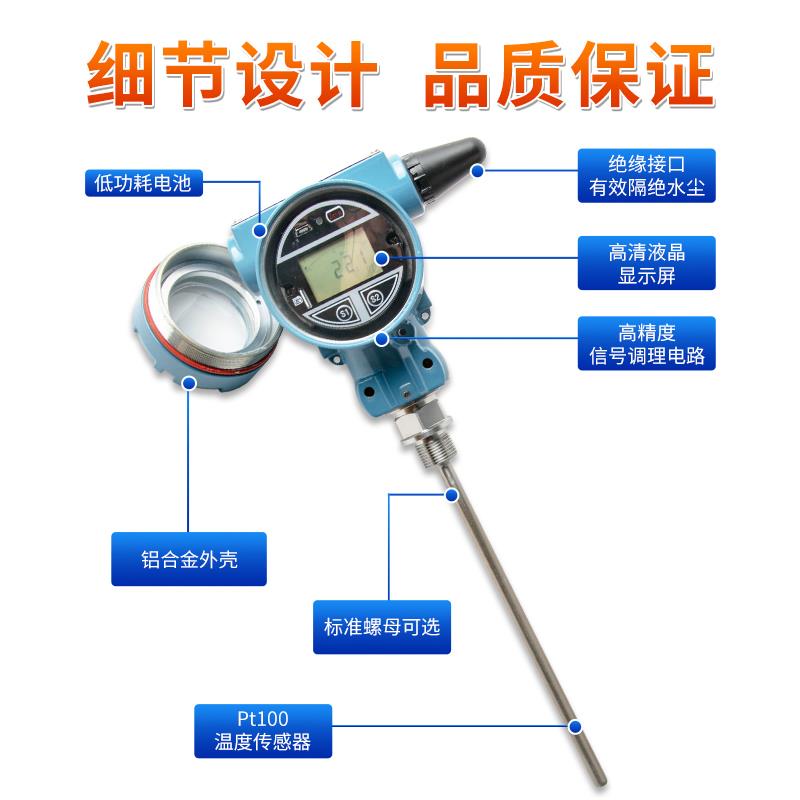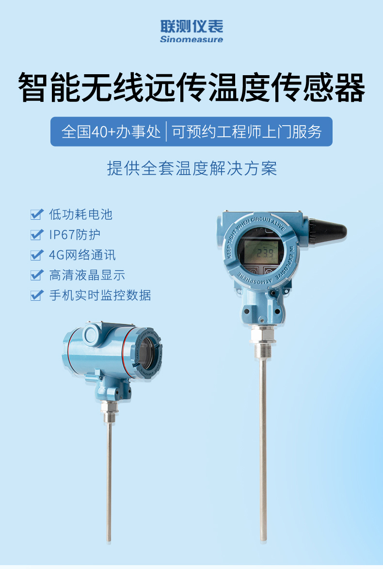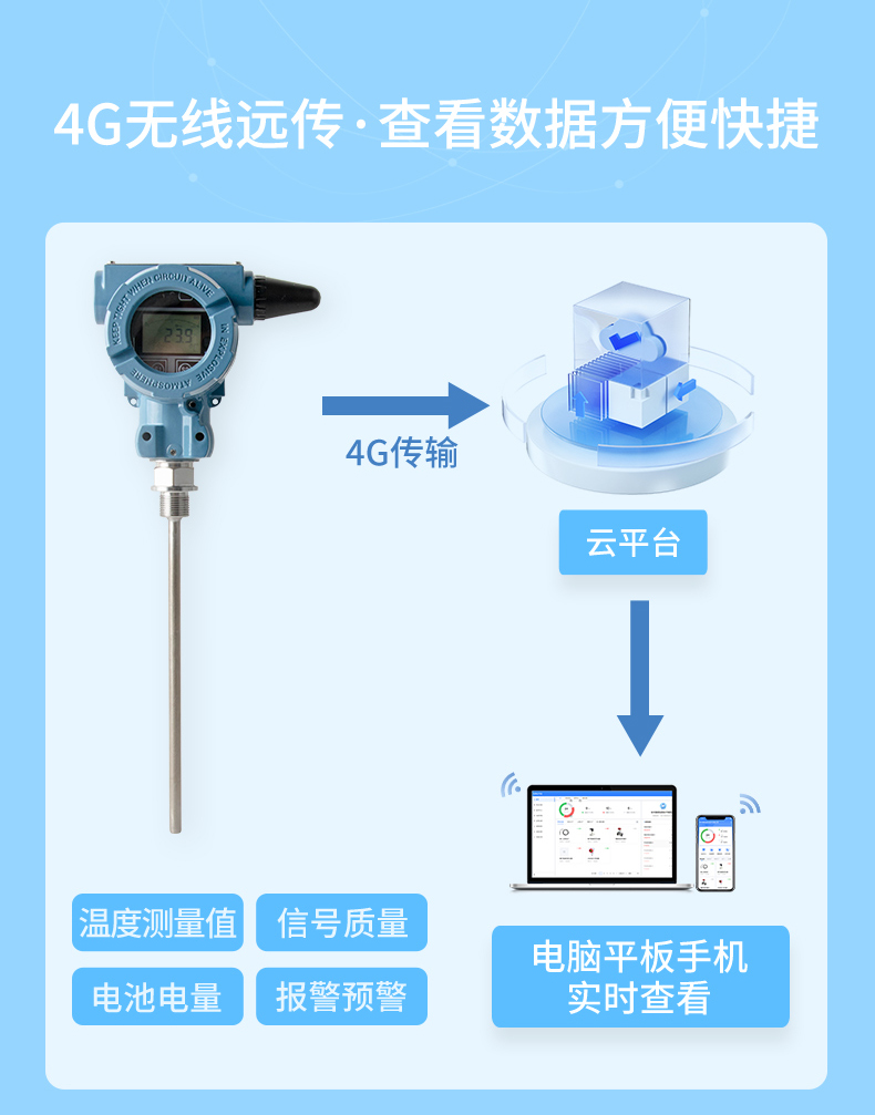 无线温度变送器是基于 4G 无线通讯网络使温度的测量、变送、上报为一体的低功耗智能仪表。产品采用 Pt100 温度传感器作为敏感元件,高精度信号调理电路,低功耗电池电源管理,丰富的 LCD 显示界面于一体,周期性上报温度测量值、电池电量、信号质量等数据,并且能够在温度超出设置范围时及时报警,提前预警故障隐患。