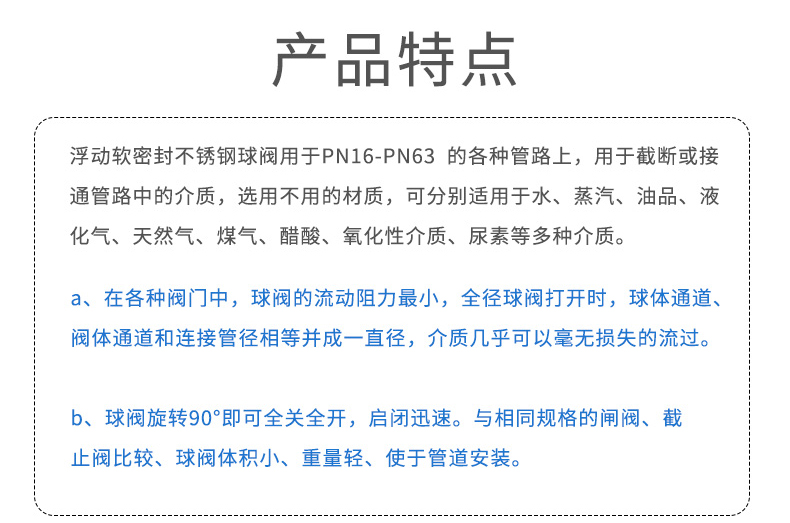 不锈钢球阀用于PN16-PN63的各种管路上,用于截断或接通管路中的介质,选用不用的材质,可分别适用于水、蒸汽、油品、液化气、天然气、煤气、醋酸、氧化性介质、尿素等多种介质。咨询热线:400-185-1718