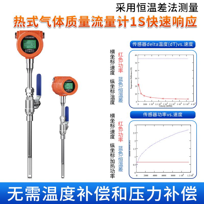 热式气体质量流量计是基于热扩散原理而设计的,该仪表采用恒温 差法对气体进行准确测量。具有体积小、数字化程度高、安装方便,测量准确等优点。