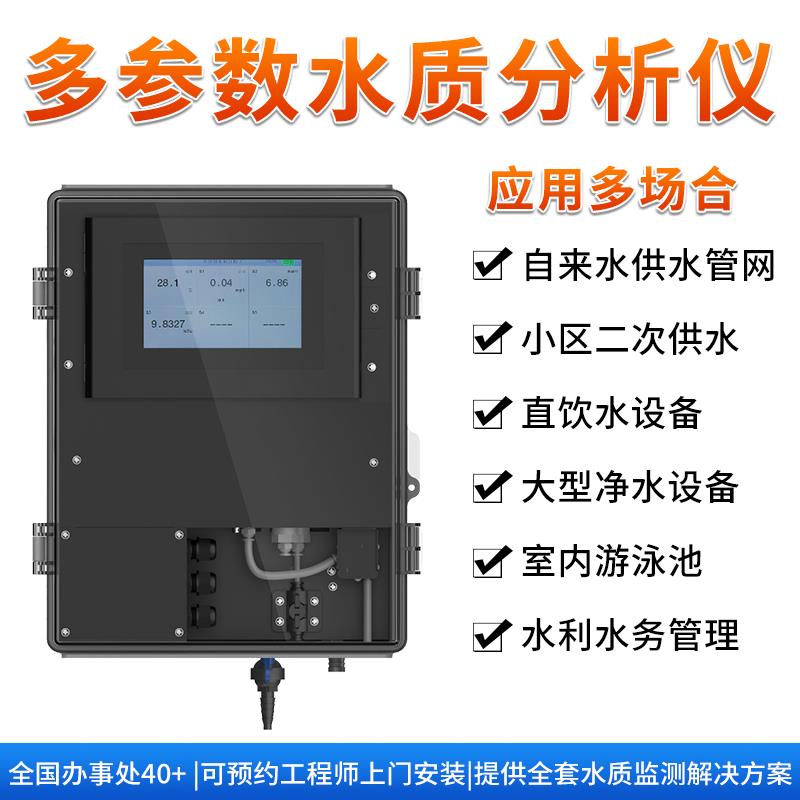 多参数水质在线分析仪是一款水质监测设备,该设备可广泛用于城市或村镇自来水厂、自来水输水管网、自来水二次供水、用户末梢、室内游泳池、大型净水设备和直饮水等水质在线监测,是水厂生产过程控制、水利水务管理、卫生监督等领域必不可少的在线分析设备。 多参数水质分析仪监测参数包括 pH、浊度、余氯(二氧化氯、臭氧)、温度、电导率(TDS、盐度)、ORP 等。可根据客户需要,增加或减少监测参数。