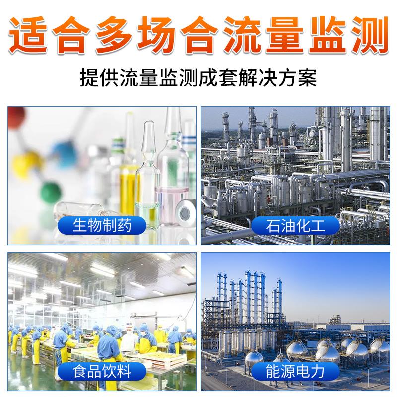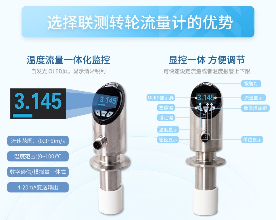 转轮流量计结构简单、稳定性高、安装维修使用方便等特点,可对管道中的液体流动及温度情况进行实时监控,提供流量及温度的信号输出,流量及温度报警开关输出,并采用 OLED 显示屏实时显示流体流速及温度,实现管道当中温度流量一体式的监控。被广泛应用于半导体、光伏、石油化工、电力、治金、钢厂、造纸、食口品加工、水处理、电池厂等行业。