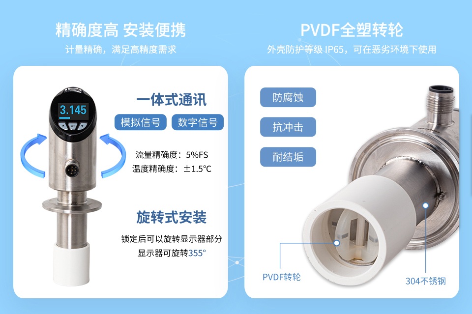 产品特点:转轮耐结垢、耐腐蚀;温度和流量一体式传感器