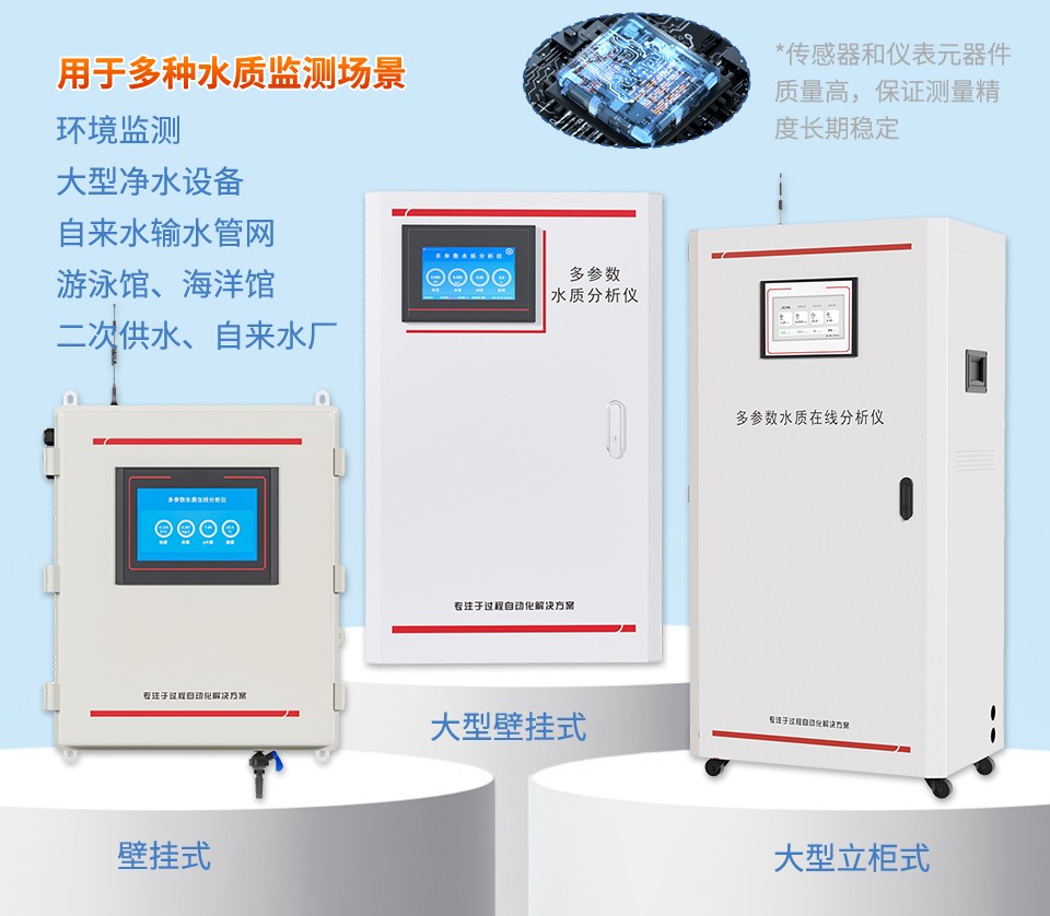 多参数水质在线分析仪是本公司自主研发制造的新一代饮用水水质监测设备,该设备可广泛用于城市或村镇自来水厂、自来水输水管网、自来水二次供水、用户末梢、室内游泳池、大型净水设备和直饮水等水质在线监测,是水厂生产过程控制、水利水务管理、卫生监督等领域必不可少的在线分析设备。