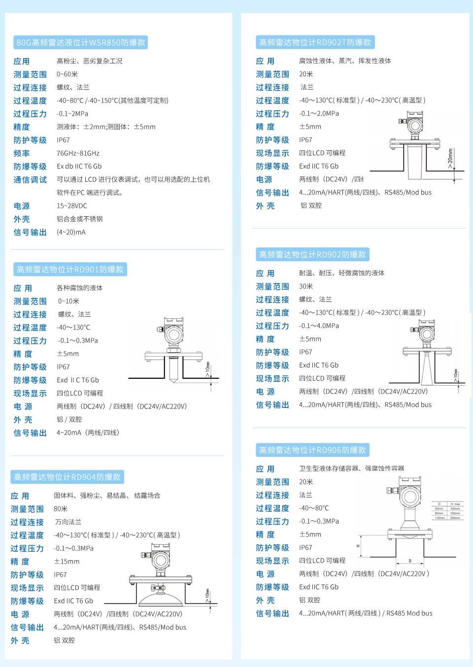 80G高频防爆雷达液位计工作频率更高,波长更短,所以尤其适合固体应用,通过透镜发射接收电磁波的工作方式,在高粉尘,恶劣温度环境下具有独特的优势。仪表提供法兰或者螺纹的连接方式,使得安装便捷简易。