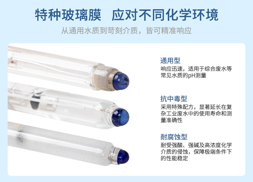 pH 玻璃电极是由玻璃指示电极和银/氯化银参比电极组合在一起的复合电极,作为 pH 值测量传感器广泛应用于测量水溶液中的 pH 值。使用场景:自来水、地表水、含镍废水、含铬废水等。