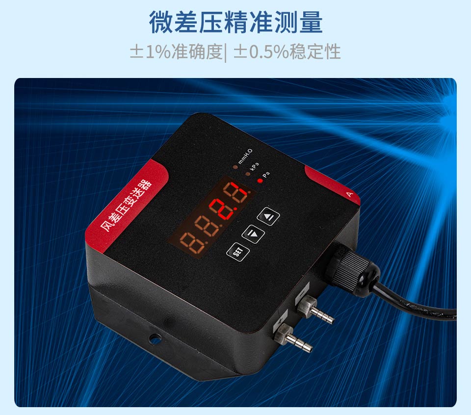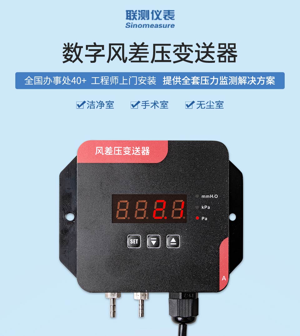 数字风差压变送器采用原装进口差压传感器做为感压元件,配合超低功耗数字调理电路,使其具有精度高、长期稳定性好等特点。与机械差压计相同的安装方式,便于工程人员现场安装调试。该系列数字风差压表可用于洁净室、手术室、无尘室、通风系统、 风机测试等对于高精度微差压的测量与控制。