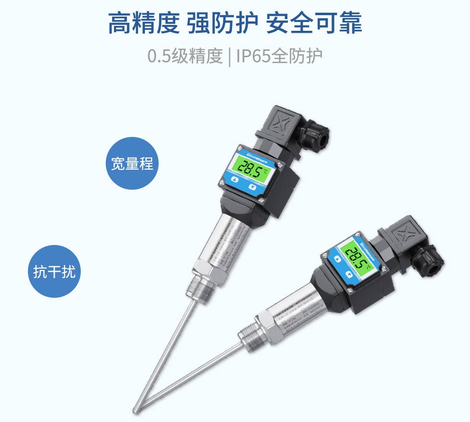 本产品使用高稳定性的电路进行信号处理,实现温度连续测量和输出,采用高精度24位ADC转换为数字信号,同时可以实现显示、远传等功能。广泛应用于石油、化工、电力、轻纺、环保等领域中对水或油的温度测量。