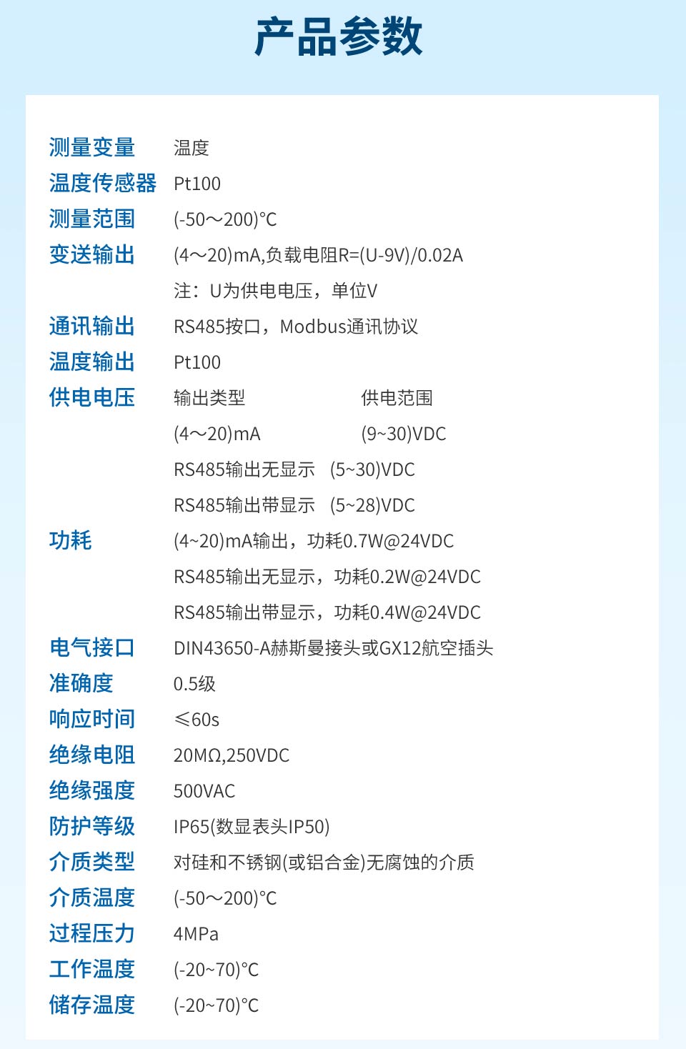 准确度:0.5 级响应时间:T90≤60s防护等级:IP65(数显表头 IP50)