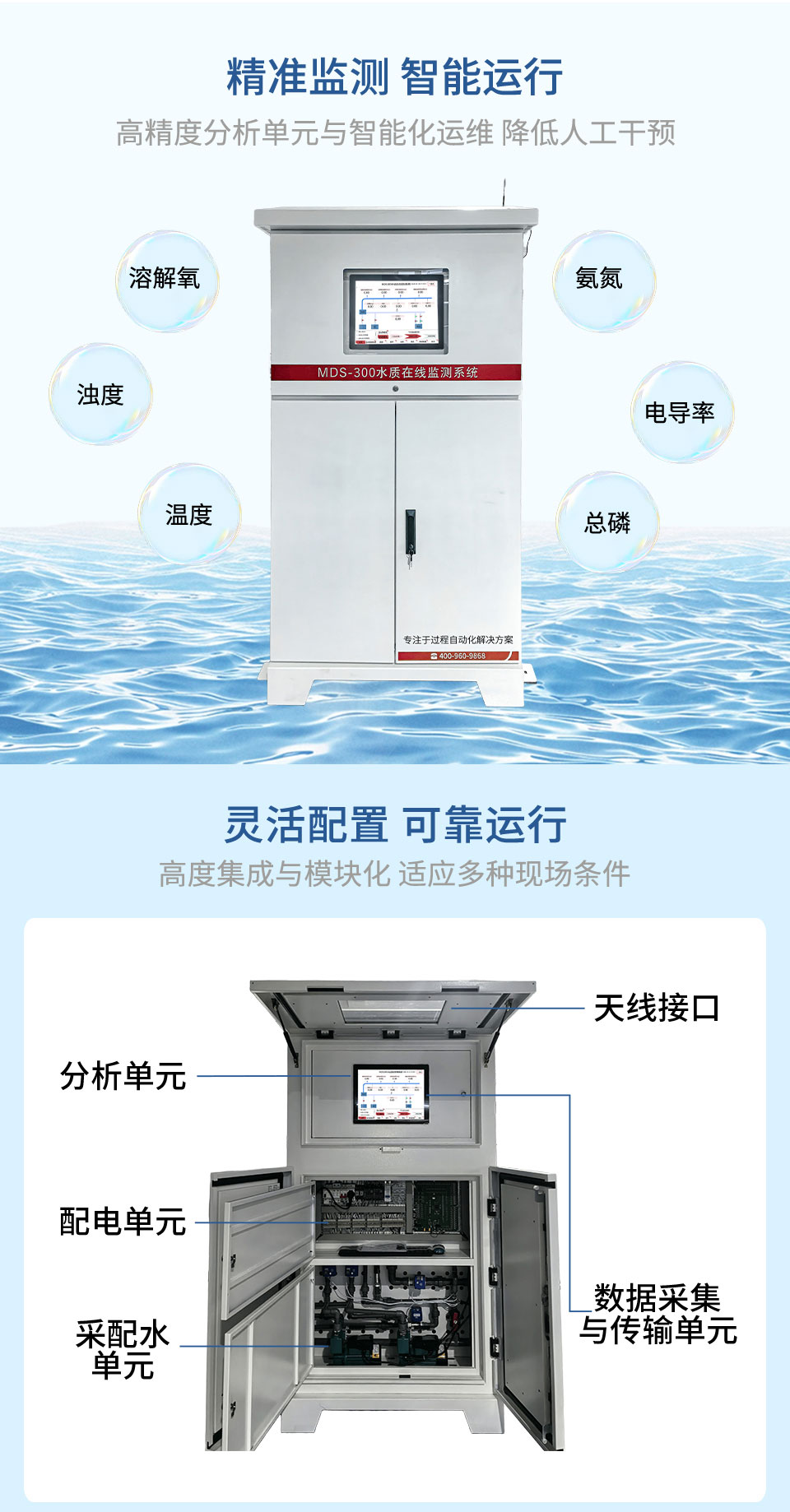 MDS-300 水质在线监测系统,集成多参数同步监测、自动清洗、恒温调节等智能技术,支持COD、氨氮、总磷、pH、溶解氧、浊度、电导率、温度等指标定制。IP55防护,15寸触摸屏,4G+网口通信,适用于河流湖泊、污水处理、供水工程等场景。全国40+办事处,工程师上门安装,提供一站式水质监测解决方案。