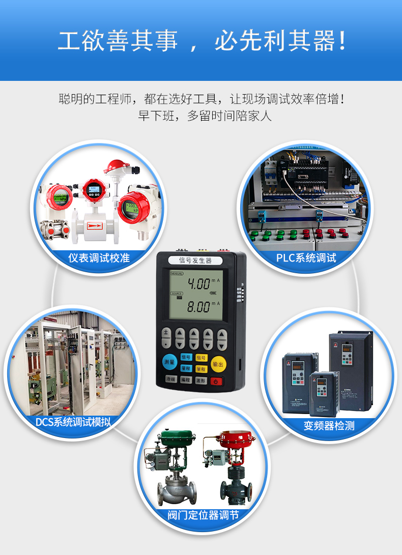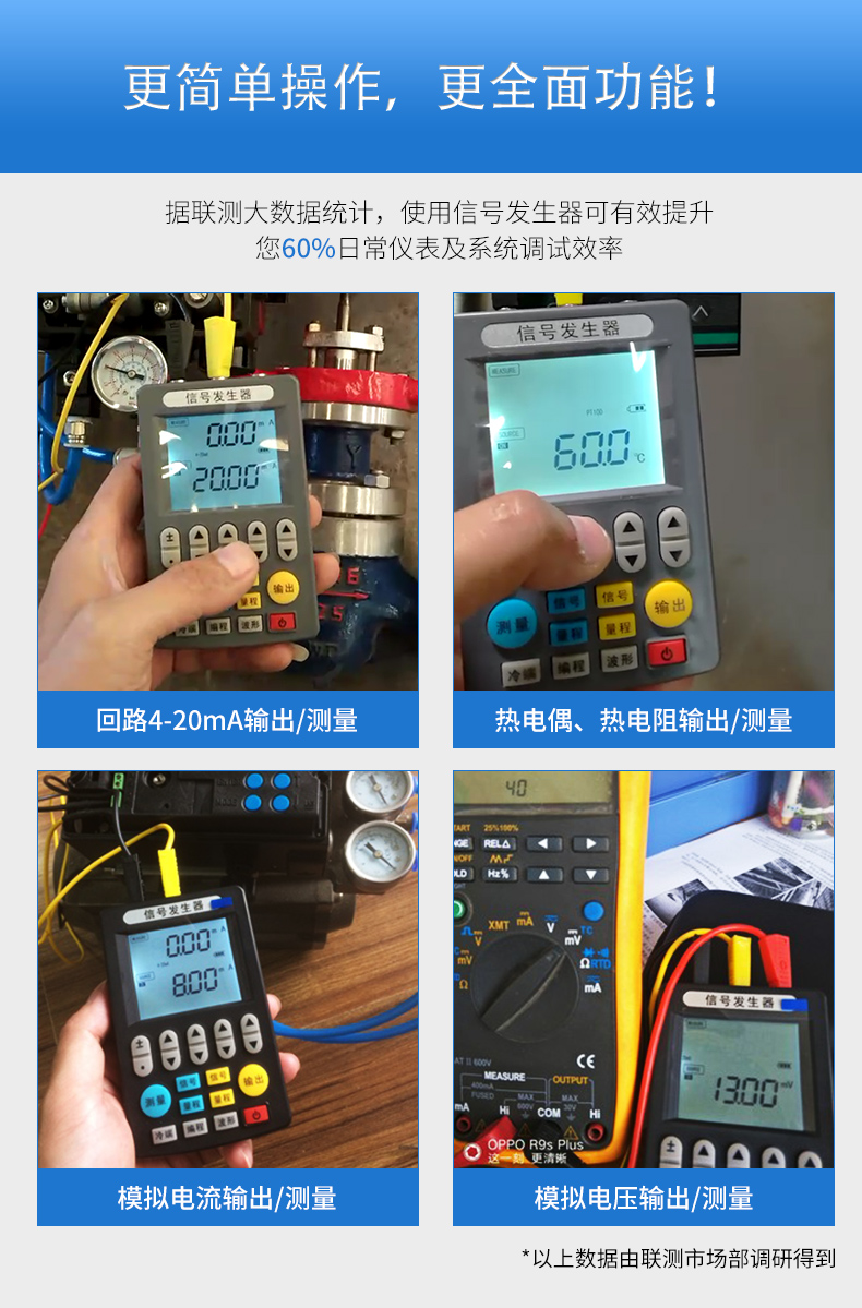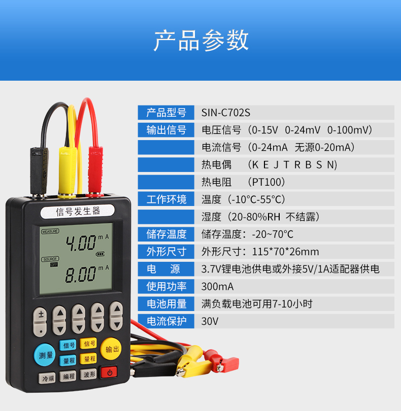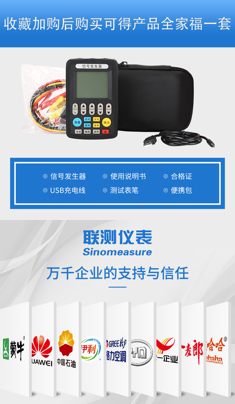 信号发生器具有多种信号的测量和输出功能,包括电压、电流、热电偶,采用高清LCD液晶屏和功能分明的硅胶按键,操作简单,待机时间长,精度高,并且具有可编程输出的功能。