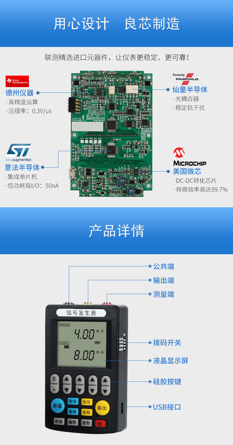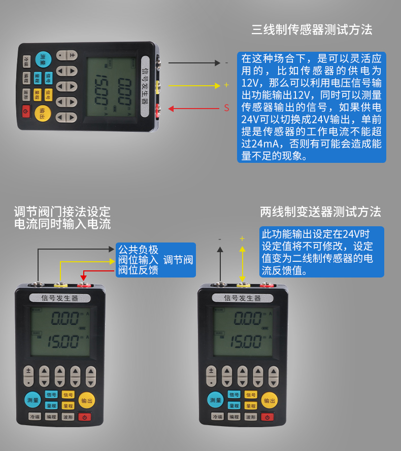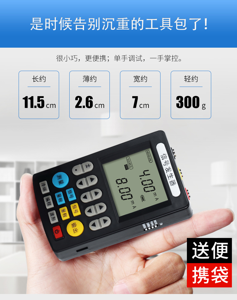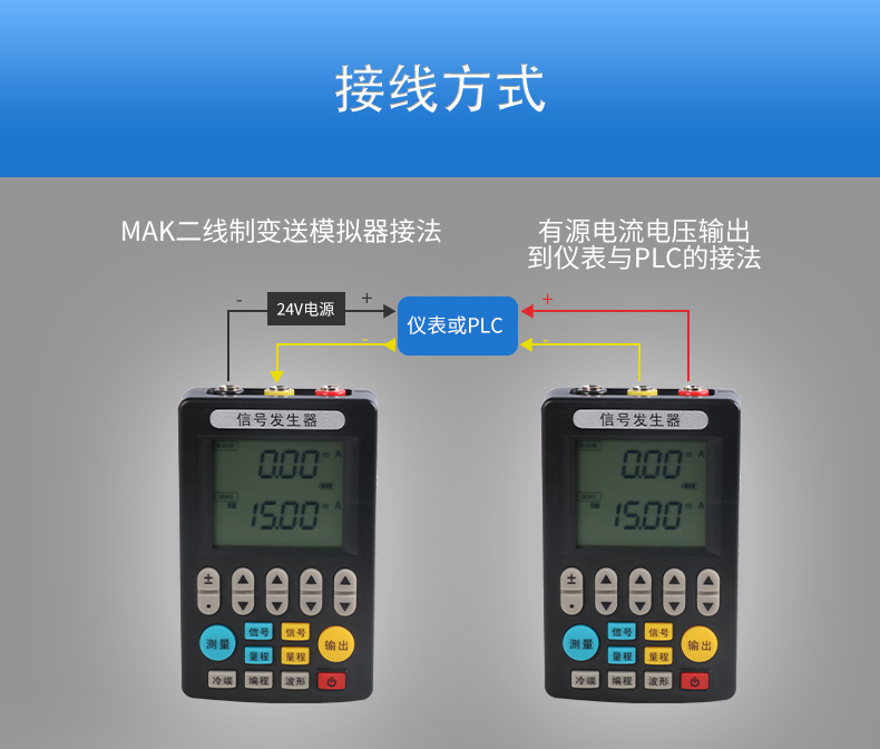 信号发生器具有多种信号的测量和输出功能,包括电压、电流、热电偶,采用高清LCD液晶屏和功能分明的硅胶按键,操作简单,待机时间长,精度高,并且具有可编程输出的功能。