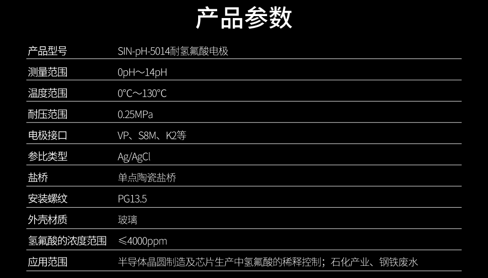 pH-5014 电极是由耐氢氟酸的 pH 敏感玻璃膜制成, 该电极能适用于含氢氟酸水体中的 pH 值测定。