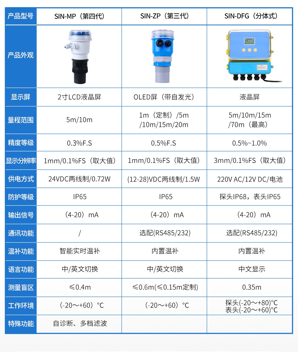 准确度:0.3%FS盲区: ≤0.4m(5m、10m) ;≤0.6m(15m)防护等级:仪表(IP65) 探头(IP68)